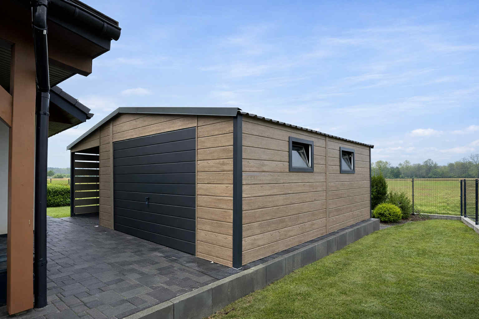 W Blachmet stawiamy na najwyższą jakość. Nasze garaże wykonujemy z blachy stalowej ocynkowanej ogniowo, co gwarantuje doskonałą odporność na korozję. Szkielet konstrukcji stanowią solidne kątowniki stalowe, a w linii Premium stosujemy jeszcze trwalsze profile zamknięte (rynienkowe), które zapewniają dodatkową sztywność i stabilność całej konstrukcji. Dla wersji drewnopodobnych używamy blachy z nadrukową teksturą drewna, która łączy trwałość stali z naturalnym, ciepłym wyglądem.