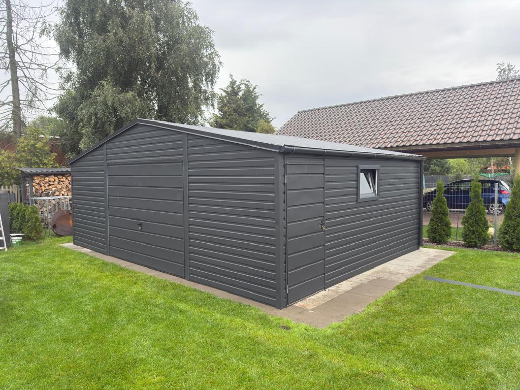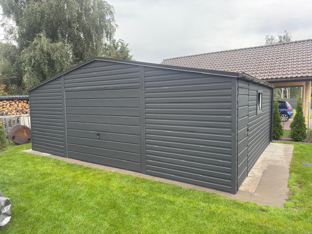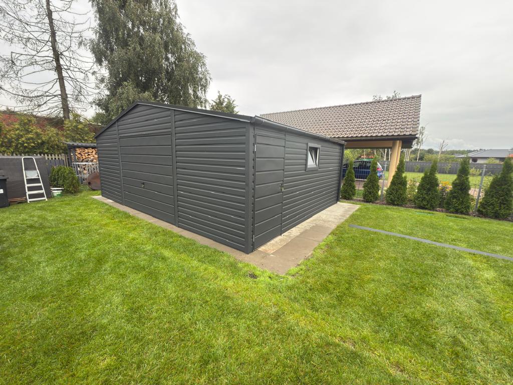 Garaż blaszany 6x5m dwuspadowy antracyt z bramą uchylną – montaż i cena